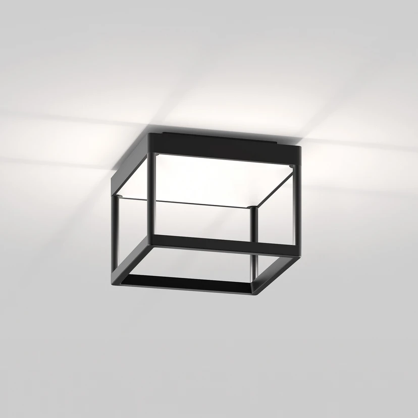 Plafonnier LED Reflex² S, parallélépipède ouvert, 2.700 K, gradation externe par triac, base 20 cm x 20 cmLe plafonnier LED Reflex² S a été conçu par Jean-Marc da Costa, l'un des fondateurs et directeurs de serien.lighting. Son cadre ouvert avec de fines entretoises est fabriqué en aluminium. Les LED sont intégrées sur les faces supérieures des entretoises inférieures derrière un verre plat et rayonnent en direction du plafond, où la lumière tombe sur un réflecteur prismatique en plexiglas.Des LED de haute qualité sont intégrées d'origine et offrent une lumière blanc chaud avec un bon rendu des couleurs. L'intensité lumineuse peut en outre être réglée de manière externe par un triac.