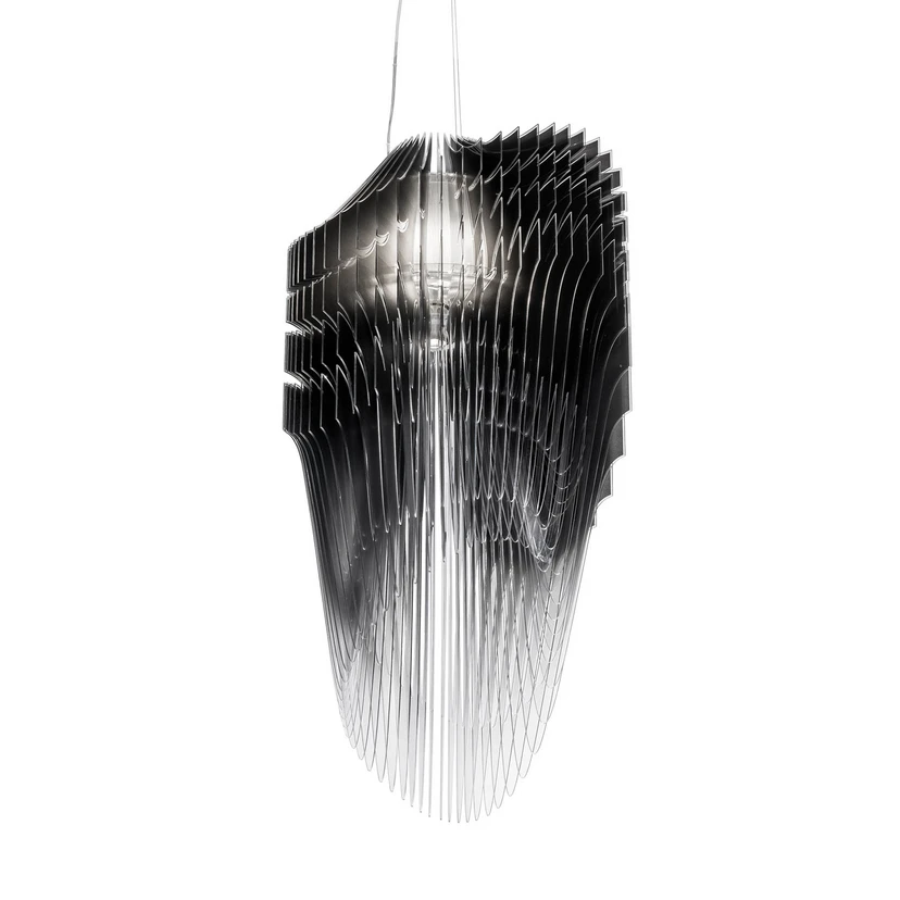 Suspension exclusive Avia avec abat-jour élégant L'abat-jour élégant de la suspension Avia crée des formes fluides et dynamiques grâce au matériau innovant Cristalflex® et apporte un effet de lumière fantastique dans chaque pièce. Ce luminaire exclusif a été créé d'après un projet de l'architecte Zaha Hadid. Hadid a déjà été reconnue dans le monde entier et a reçu de nombreuses récompenses pour son architecture exceptionnelle, comme par exemple pour le musée interactif Phaeno à Wolfsburg ou le London Aquatics Centre. La suspension Avia rappelle par sa forme une construction architecturale et présente en même temps un style Urbane. 50 couches différentes de Cristalflex®, un plastique spécial développé par Slamp, ont été combinées en une forme frappante, grâce à laquelle les sources lumineuses fournissent un éclairage unique. Cela permet d'illuminer chaque espace de vie avec goût et de créer une ambiance très particulière. La suspension Avia devient un objet design particulier dans chaque pièce, grâce à des matériaux de qualité et une finition artistique de haut niveau.