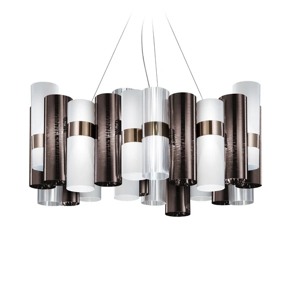 La forme enchanteresse des cylindres est un hommage aux années 1950 et restera toujours dans les mémoires grâce au nom frappant de La Lollo. Trois cordes fines forment la suspension et se terminent par un baldaquin rond. L'abat-jour de la lampe suspendue est composé de technopolymères qui entourent un anneau de LED lumineuses. Le fabricant Slamp a breveté des matériaux innovants qui constituent l'élément de base de ce chef-d'œuvre. Christalflex®, Lentiflex® et Opalflex® ont été développés pour obtenir un effet lumineux grandiose et incomparable. En outre, ils sont particulièrement résistants et légers comme une plume. Les différents connecteurs et éléments courbes, qui sont tous fabriqués à la main, forment un volume tridimensionnel et confèrent à la suspension La Lollo un aspect particulier.
