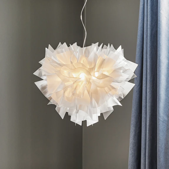 La beauté n’est pas toujours une question de goût car lorsqu’il s’agit de la suspension Veli Prisma Large, la plupart des clients tombent d’accord. Cette lampe séduit par une élégance épurée qui dotera toute pièce d'un charme certes en retenue mais indéniable. De loin et au premier regard, la conception soignée de la suspension Veli Prisma Large fait penser à du tissu ; l’effet de surprise est garanti. Ce n’est qu’en s’approchant que l’on distingue tous les plis du matériau synthétique. Pour ce faire, c’est le tout nouveau matériau Prisma Lentiflex® qui a été utilisé. Un plissage complexe a été applique à sa structure proche de celle de la soie, le tout donnant l'impression d'un tissu soyeux qui aurait été froncé.