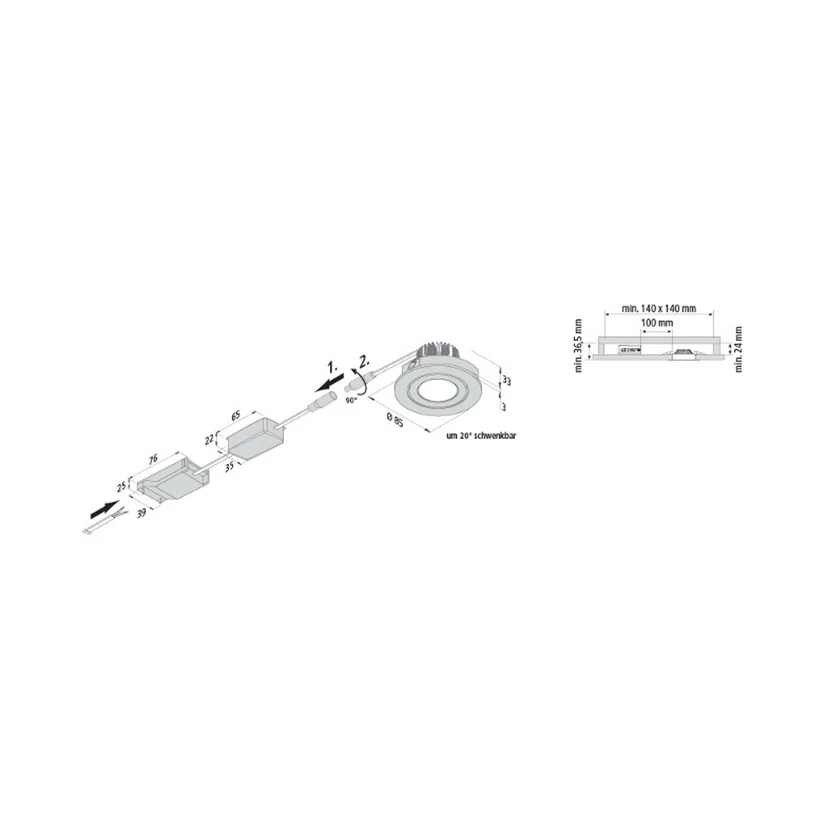 Luminaire encastrable LED rond Eco SR 68 avec driver LED variable Le spot LED rond Eco SR 68 à encastrer dans le plafond est équipé d'un module d'éclairage orientable sur 20°. La lumière émise dans un angle de 24° peut ainsi être utilisée pour l'éclairage ciblé d'une zone - y compris driver LED avec borne de raccordement pour 230 V avec câblage traversant intégré - raccordement simple du luminaire grâce à la fiche DC - gradation externe par phase ; variateurs recommandés : Busch-Jaeger 2247U ou 6523U-102, Jung 266GDE ou GIRA 117600/I03 - convient aussi pour l'encastrement dans un meuble