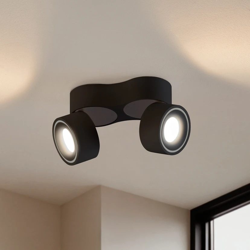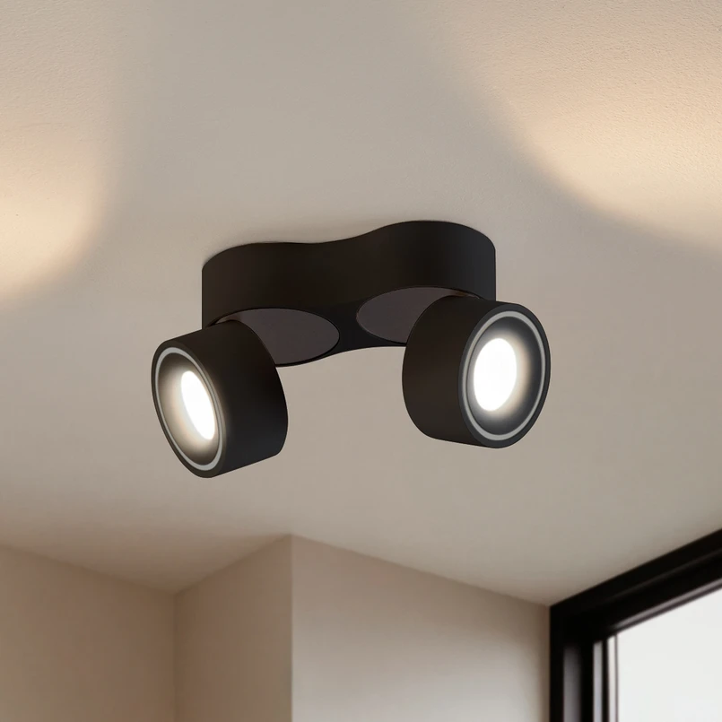 Spot pour plafond LED noir Rotari avec deux spots flexibles Le spot pour plafond LED Rotari à 2 lampes possède un boîtier en aluminium au centre duquel se trouve un réflecteur intégré. Avec un angle de rayonnement de 34°, il diffuse une lumière blanche chaude (3 000 K) dans la pièce. La lampe présente en outre un indice CRI > 80 et donc un rendu des couleurs élevé. Par ailleurs, Rotari peut éclairer certaines zones de la pièce de manière ciblée, car la tête de la lampe peut être tournée à 350° et orientée à 90°. C'est pourquoi ce petit spot convient non seulement aux pièces d'habitation privées, mais aussi aux espaces professionnels.
