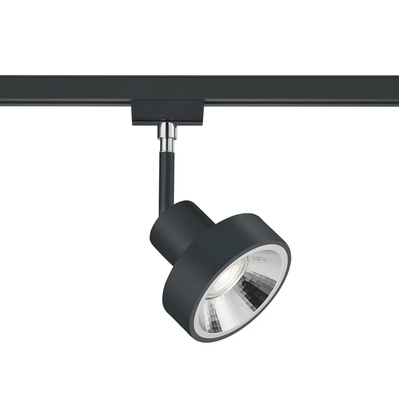 Projecteur GU10 à tête large pour rail électrique biphasé DUOline Ce spot moderne se prête à un éclairage de surface - notamment avec le choix d'une ampoule GU10 à distribution extensive (voir accessoires). La large tête est revêtue d'un réflecteur à l'intérieur. Grâce à son utilisation dans le système de lampes sur rail biphasé DUOline, le spot peut être déplacé selon les besoins ; la fixation orientable sur tous les côtés permet d'orienter la lumière.