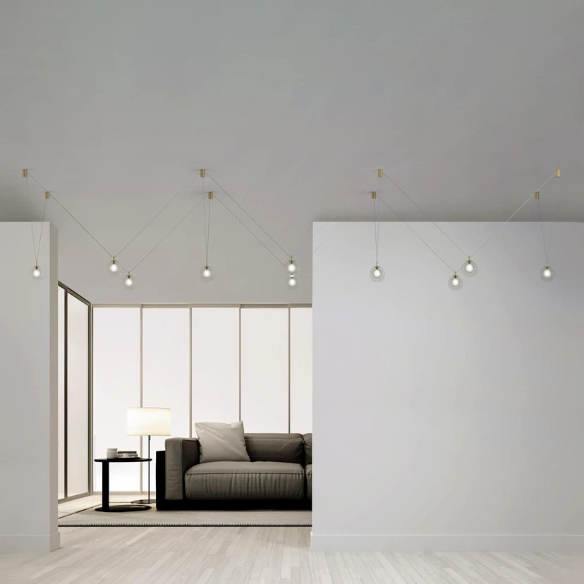Suspension à 10 lampes Aladino avec onze points de fixation La suspension Aladino est un diffuseur de lumière exceptionnel et élégant qui sert également d'objet d'aménagement adéquat dans des locaux commerciaux représentatifs. Dix abat-jour en verre borosilicaté clair, satiné à l'intérieur, sont fixés par de fins tronçons de câble à onze points de suspension en métal à la finition dorée brossée. Chacun des rosaces peut être raccordé au réseau électrique, ce qui facilite le placement flexible de la suspension. Les abat-jour peuvent être disposés non seulement en ligne, mais aussi dans n'importe quel ordre.