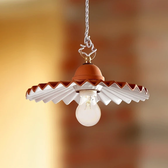 Lampe suspendue ARGILLA en céramiqueLa lampe suspendue ARGILLA permet de compléter le style campagnard dans la cuisine ou la salle à manger. L'abat-jour plat en céramique à structure ondulée est de couleur argile naturelle sur la partie supérieure et émaillé de blanc sur la partie inférieure, ce qui attire joliment le regard. Il dirige la majeure partie de la lumière vers le bas, sur la table.