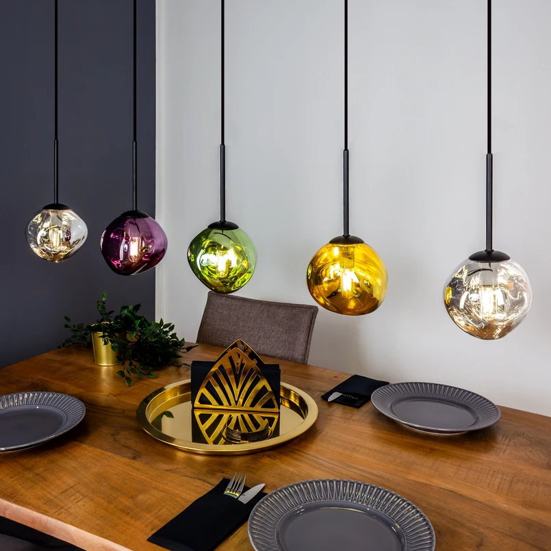 Suspension à 5 lampes Canopus avec abat-jour en verre teinté presque sphérique La suspension Canopus attire tous les regards avec ses cinq abat-jours en verre coloré qui ont la forme d'une boule de lave en fusion. Les abat-jour en verre se présentent deux fois dans une teinte argentée et une fois dans une teinte dorée, verte et violette et abritent chacun une douille E14 (veuillez utiliser des ampoules tubulaires). La suspension noire se compose de capuchons et d'une rosace rectangulaire en aluminium ainsi que de câbles fins.