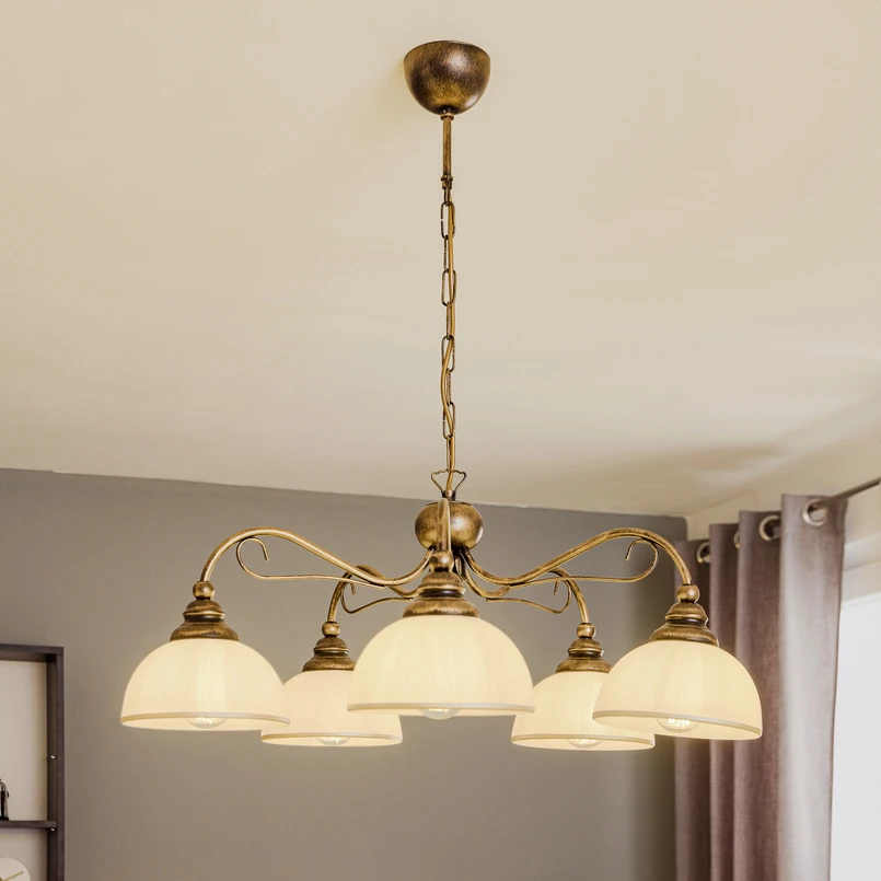 La suspension Casale à 5 lampes allie le charme antique à la fonctionnalité moderne. Fabriquée en métal et en verre de haute qualité, elle brille dans une élégante finition en laiton vieilli qui donne une touche particulière à chaque salon ou salle à manger. La combinaison d'un matériau robuste et d'un design classique fait de cette lampe un élément phare intemporel dans chaque pièce.
