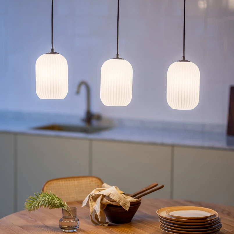 Suspension à 3 lampes Cava pour un éclairage d'ambiance de table ou de comptoir La beauté de la suspension Cava ne réside pas seulement dans l'éclairage d'ambiance qu'elle diffuse au-dessus d'une table ou d'un comptoir de cuisine, mais aussi dans le contraste entre la suspension noire sobre et les trois abat-jour en verre opale aux formes attrayantes et dotés d'une structure rainurée décorative. Ils créent une ambiance lumineuse pleine d'effet. - gradation externe - avec câbles textiles noirs - hauteur de suspension réglable uniquement lors du montage