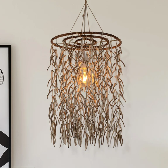 Les palmiers, la plage et la mer - la lampe à suspension Kokos nous le rappelle. Des éléments se balançant librement étaient fixés à un anneau de rotin. Ces éléments individuels donnent à la lampe son aspect naturel, car ils sont faits de véritable noix de coco. L'ampoule est située au milieu et est facile à voir, il est donc recommandé d'utiliser une ampoule à filament. Afin de créer une atmosphère particulièrement chaleureuse, les éléments en coco sont éclairés par derrière, ce qui projette un beau jeu d'ombre sur les murs. La lampe est un véritable accroche-regard et convient au salon moderne.