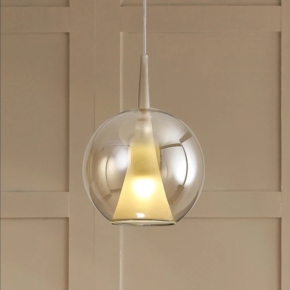 Suspension Elsa avec abat-jour en verre teinté bronze La suspension Elsa se distingue par son abat-jour à double couche en forme de boule. L'extérieur est en verre teinté bronze et l'intérieur est doté d'un abat-jour conique satiné. Cela confère au luminaire non seulement un aspect très particulier et plein d'effet, mais garantit également un effet lumineux agréable. Une source de lumière élégante pour la salle à manger, le salon et même la chambre à coucher, qui éclaire agréablement de nombreux espaces, que ce soit individuellement ou à plusieurs, en ligne ou en groupe.