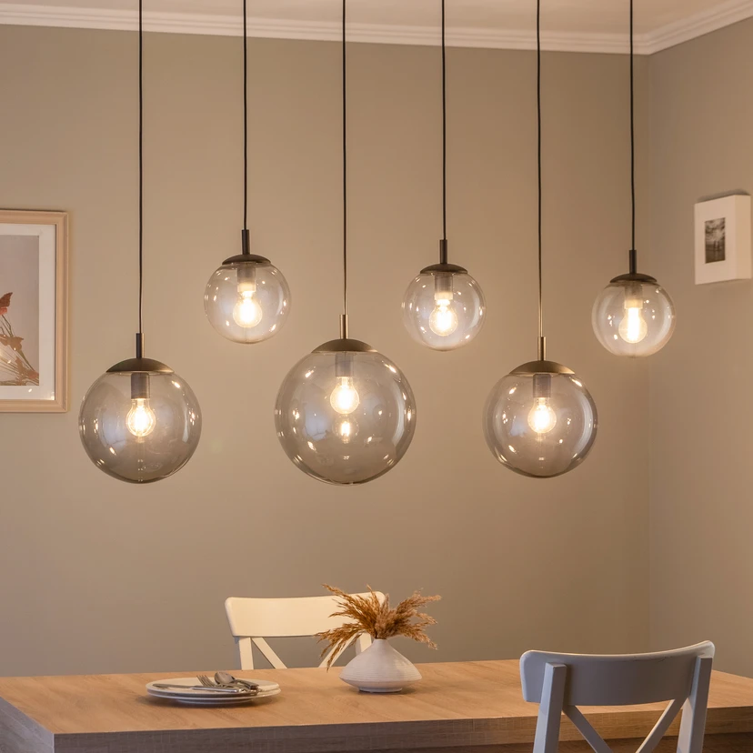 Suspension en verre Esme avec six abat-jours sphériques gris graphite en ligne La suspension Esme plaît avec ses six abat-jours sphériques de différentes tailles, alignés les uns à côté des autres. Les verres sont teintés en gris graphite et laissent entrevoir l'ampoule à utiliser. Les supports, les câbles et la rosace sont noirs.