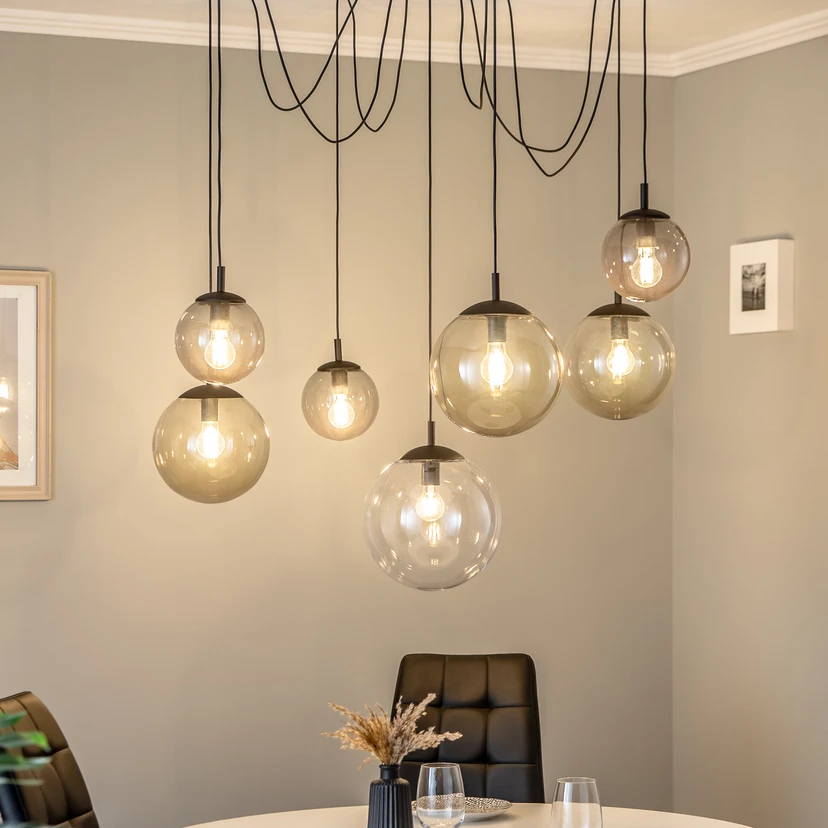 Suspension en verre Esme avec sept abat-jours sphériques de différentes couleurs, décentralisés La suspension Esme plaît avec ses sept abat-jours sphériques de différentes tailles qui peuvent être placés de manière variable grâce à des points de fixation décentralisés. Les verres sont alternativement bruns, gris graphite et transparents et laissent entrevoir l'ampoule à utiliser. Les supports, les câbles et la rosace sont noirs.