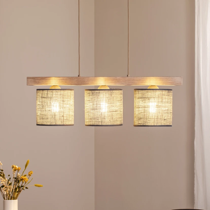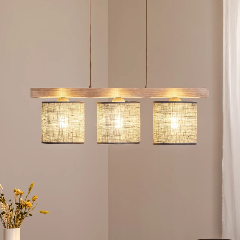 Suspension Forest, à 3 lampes, bois clair, jute gris
