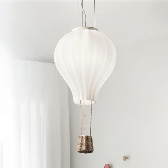 Cette suspension fera battre plus fort le cœur des amateurs de vols en montgolfière : Dream Big est une suspension originale en forme de montgolfière. Un abat-jour en verre opalin, qui abrite une douille E27, forme le ballon ; une nacelle en corde brune est suspendue en dessous.