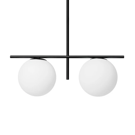 Suspension à deux flammes Jugen en verre et métalLa suspension de la suspension Jugen se compose de deux tubes que l'on peut utiliser en deux tailles et influencer ainsi la hauteur souhaitée. À partir de la tige de suspension au centre, une ligne droite en métal se ramifie et est équipée de deux abat-jour sphériques. Les abat-jour en forme de boule sont en verre soufflé blanc, qui est éclairé par les lampes utilisées. Ce luminaire fait partie de la ligne de produits Miloox de Sforzin, qui se caractérise par un design inhabituellement frais et la combinaison de matériaux tendance.