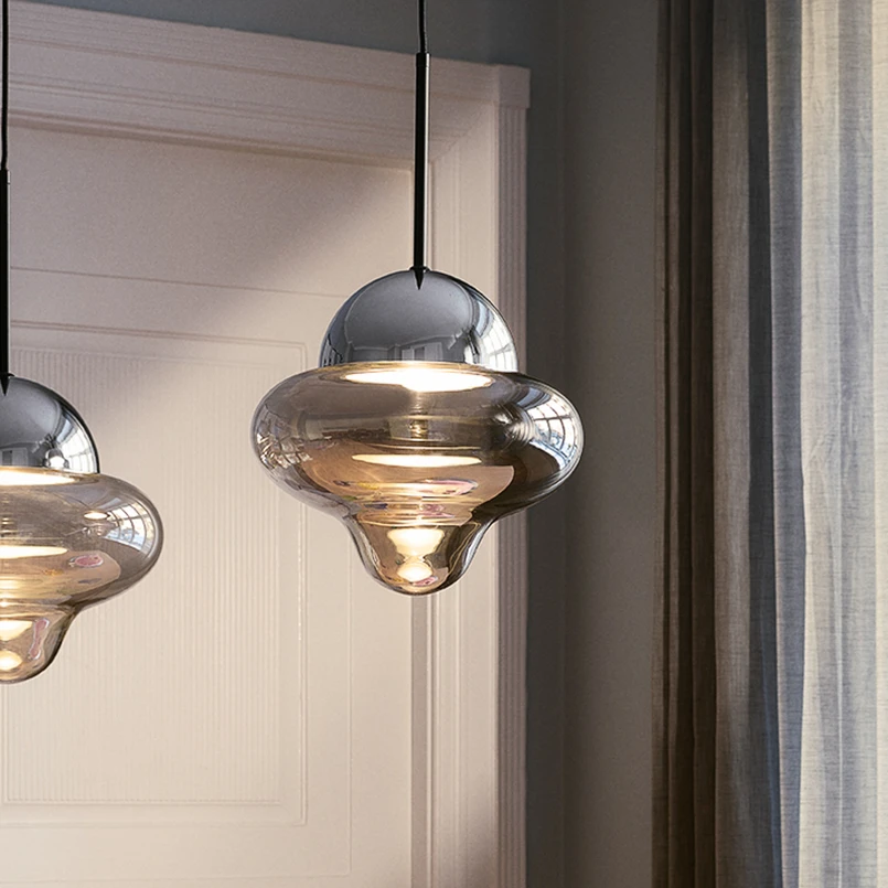 Suspension LED Nutty en verre soufflé à la bouche et métal La suspension LED Nutty s'inspire de la nature et des fines noix du chêne - tout en conservant le style ludique et unique de DESIGN BY US. La lumière blanche chaude générée par le module LED intégré rayonne comme la lumière du soleil à travers la cime des arbres, ce qui crée une atmosphère très agréable. Nutty est fabriquée en verre soufflé à la bouche et est complétée par un dôme en métal laqué. Le design danois s'inspire traditionnellement des formes merveilleuses de la nature - et DESIGN BY US a utilisé ici le noyer de chêne comme source d'inspiration pour cette luxueuse lampe de designer.
