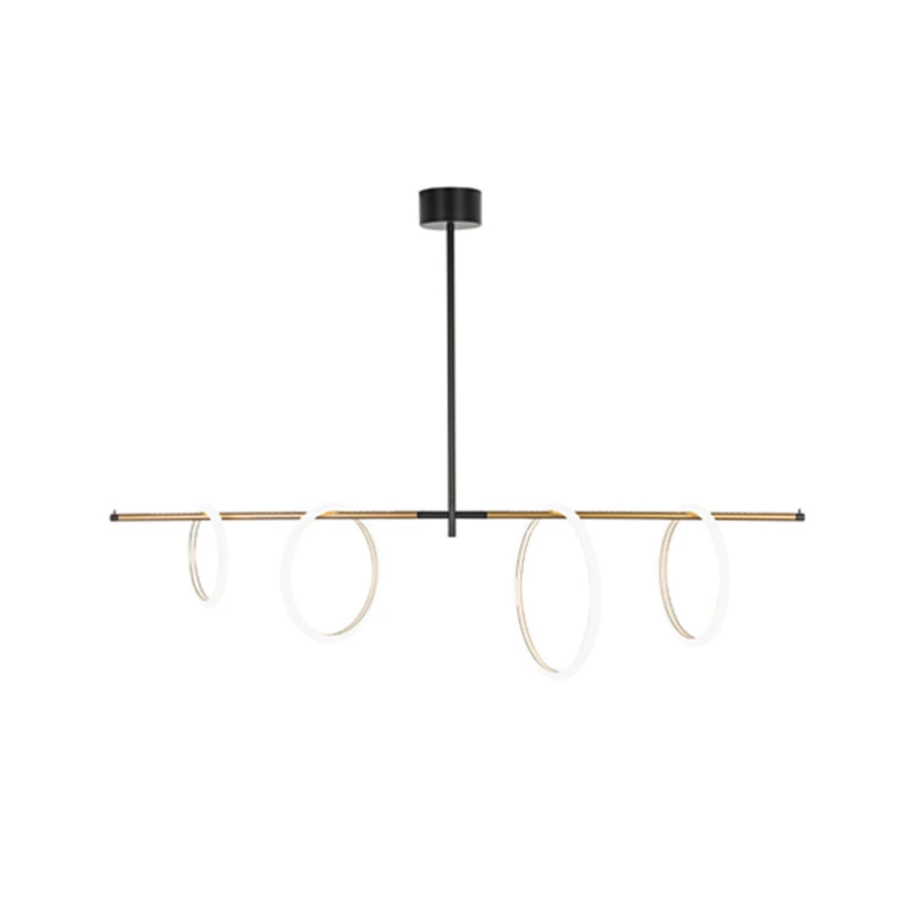 Suspension LED Ulaop au design marqué avec quatre anneaux LED lumineux La suspension LED Ulaop séduit par son design tout en apportant une touche de modernité dans l'habitat. Elle se compose d'un support avec une tige horizontale et de plusieurs points de connexion sur celle-ci, qui servent à relier les anneaux au flux électrique. Les abat-jours, qui ont la forme d'un anneau et sont fabriqués en différentes tailles, forment le contraste créatif avec le support. Les anneaux peuvent être facilement accrochés à la structure et s'allument dès qu'ils entrent en contact avec l'un des points de connexion. La suspension LED convient parfaitement à l'éclairage d'une table de salle à manger ainsi qu'à celui d'un salon - il est possible de fixer d'autres anneaux jusqu'à 28 W maxi - gradation externe (DALI, 1-10V, push dim)