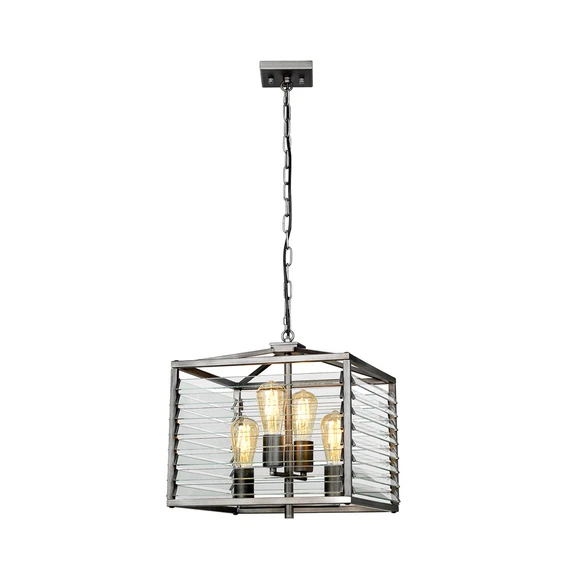 Suspension à quatre flammes Louvre - lumière diffusée librement tout autour La suspension à quatre flammes Louvre est en bronze argenté et noir brossé, les douilles sont décalées et visibles chacune derrière les lamelles de verre transparent de l'abat-jour. Cela permet d'éclairer l'environnement de tous les côtés. L'effet décoratif de cette lampe suspendue, qui peut être utilisée dans tout l'habitat pour l'éclairage de base ou de zone, peut encore être renforcé par le choix d'ampoules esthétiques, disponibles dans les accessoires. - gradation externe