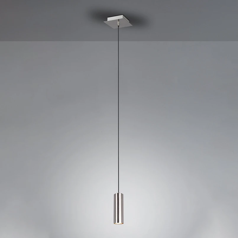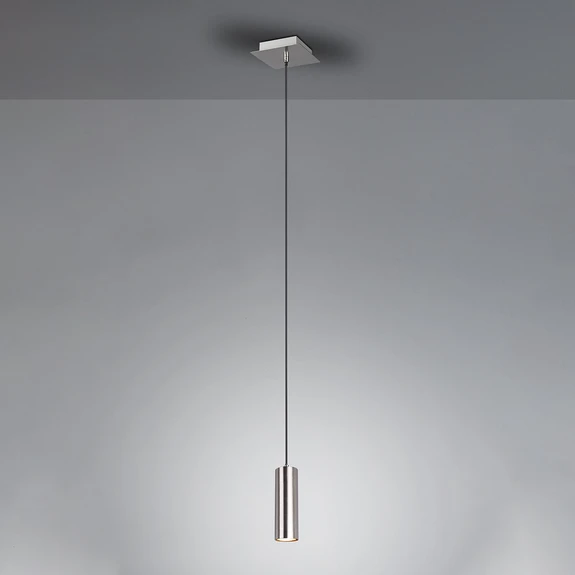 Suspension à 1 lampe Marley en nickel mat La suspension Marley est une source de lumière délicate, par exemple pour éclairer une table d'appoint dans le salon. La lampe de couleur nickel mat, avec son rosace carré et sa tête de lampe cylindrique, peut aussi très bien être montée à plusieurs, par exemple pour éclairer une table plus longue ou un comptoir.