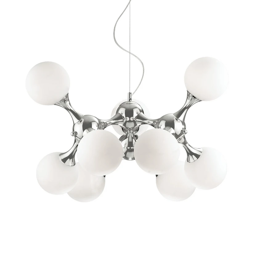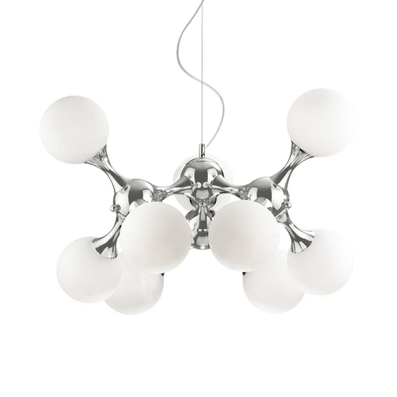 La lampe suspendue Nodi Bianco est un compagnon flexible et en même temps noble pour la maison. Grâce à la finition chromée du cadre ou des éléments de connexion, la lampe rayonne même lorsqu'elle est éteinte et donne immédiatement une impression de haute qualité. Les globes sont fabriqués en verre soufflé. Un processus final de gravure rend la surface mate et rugueuse. À l'intérieur de chacune se trouve une douille E14, dont la lumière sort douce et sans éblouissement. La lumière chaude est distribuée par les différentes orientations des boules dans toute la pièce.
