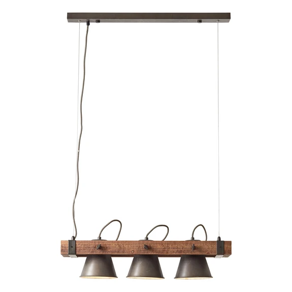 La suspension Plow à trois lampes est fabriquée en bois foncé et en acier noir. Accrochée à des câbles d'acier sur la longue rosace en métal, elle semble presque flotter dans le vide. Les abat-jour en acier noir affichent un aspect simple et sont placés dans un élément en bois foncé qui donne à la lampe un aspect rustique. Le cadre en bois abrite trois abat-jour inclinables.