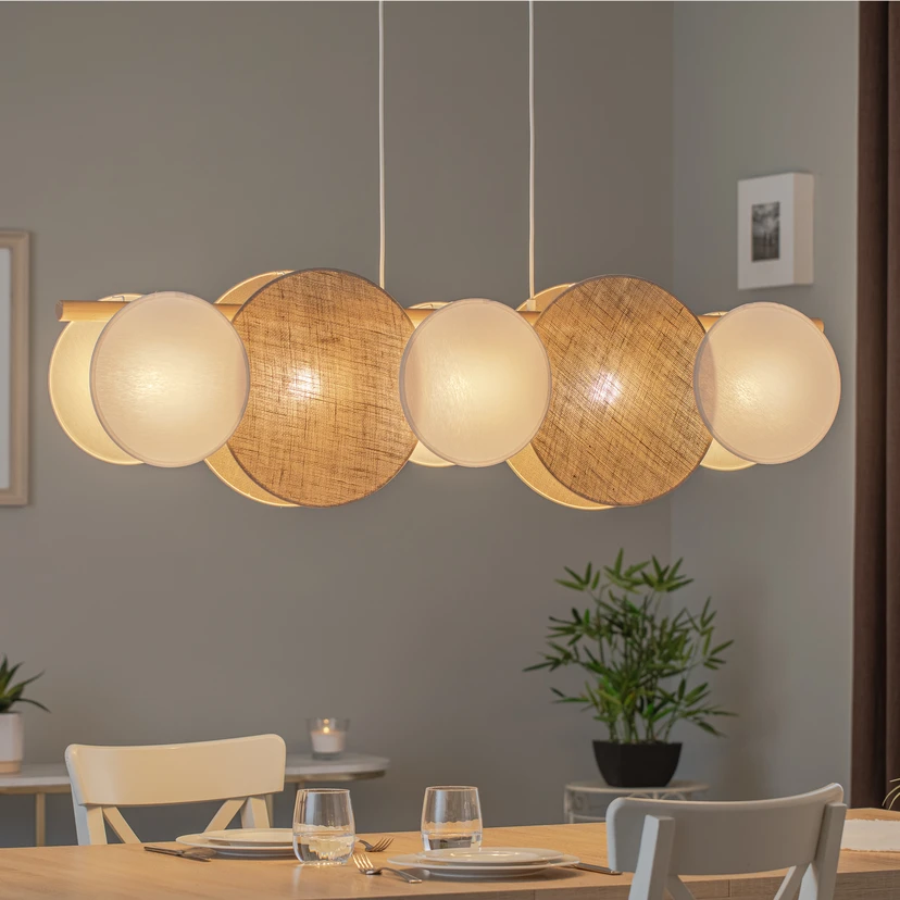 Suspension Pulse avec abat-jour en jute, cinq douilles et des poutres en bois La suspension Pulse est équipée d'abat-jour plats et ronds en textile de jute, de couleur blanche et marron naturel et de différentes tailles. Entre eux se trouvent au total cinq douilles E27. À cela s'ajoutent une poutre en bois et un rosace blanc en métal.