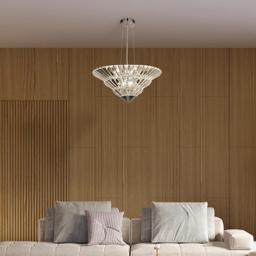 Suspension Savannah avec abat-jour en verre de cristal Avec sa structure en acier laqué couleur chrome et son abat-jour en verre de cristal, la suspension Savannah crée un jeu d'ombre et de lumière captivant. La polyvalence est au cœur du design de Savannah. Elle offre la flexibilité d'être installée en tant que suspension classique pour une pièce centrale qui attire l'attention ou en tant que luminaire à mi-hauteur plus près du plafond (à régler avant le montage), ce qui en fait le point central de tout salon ou salle à manger. Pour huit ampoules G9 au choix (non incluses, voir accessoires).