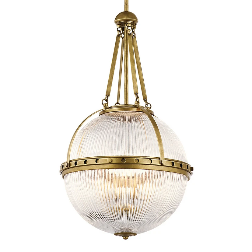 La suspension présente un abat-jour sphérique en verre rainuré. La belle sphère est maintenue par un anneau en laiton et une tige fine qui va jusqu’au plafond. Ce design original se distingue par ses formes simples et son alliance élégante des matériaux laiton et verre. La forme ronde de l’abat-jour parachève au mieux le style de la lampe et en fait un luminaire phare au plafond.