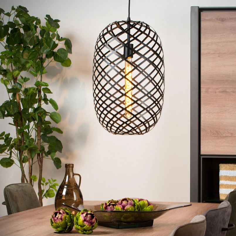 Luminaire suspendu en tungstène noir avec abat-jour ovale en maille métallique ouverte