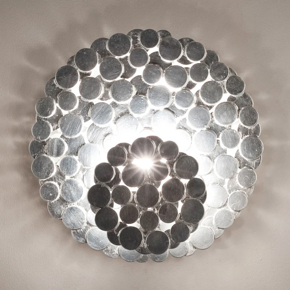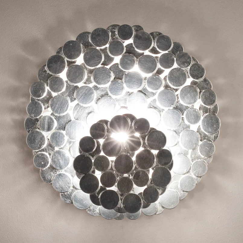 Tresor - applique murale argentée Ce bijou est composé de nombreux disques métalliques de différentes tailles qui donnent à l'applique murale sa forme ronde. Chacune d'entre elles a été soudée à la main. Une fois éclairée, l'applique murale devient un objet lumineux fascinant. Un enrichissement expressif pour les pièces d'habitation - mais aussi pour les restaurants ou les foyers d'hôtels. La manufacture de luminaires Terzani a été fondée en 1972 par le designer italien Sergio Terzani, spécialisé dans le verre. Lorsqu'au milieu des années 1980, Sergio Terzani a fait la connaissance du designer français Jean-François Crochet, des accessoires d'intérieur et des sculptures lumineuses ont dès lors vu le jour. La passion de Terzani pour l'art du verre et le sens des formes extravagantes de Jean-François Crochet se reflètent dans chacun des luminaires. Les luminaires Terzani sont donc bien plus que de simples sources de lumière. Ce sont des objets d'art créés par un excellent artisanat et avec beaucoup d'imagination et d'amour du détail.