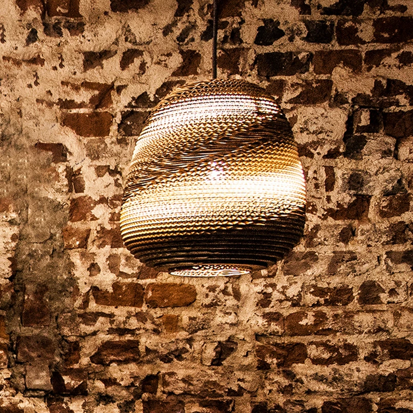 Suspension Binky 210 avec abat-jour en bandes de carton - fait main Des effets lumineux uniques et une très belle nuance de couleur des bandes de carton apparaissent dès que la lumière de la suspension Binky 210 est allumée, car elle passe alors à travers les interstices des bandes de carton ondulées et éclaire par exemple le salon d'une lumière confortable. Le luminaire a été fabriqué de manière durable aux Pays-Bas par Think Paper, un fabricant de luminaires design spécialisé dans la production d'éclairage design durable au caractère original. Le carton a été obtenu à partir de bois provenant de forêts gérées de manière responsable et tous les autres composants du luminaire ont également été fabriqués à partir de matières premières renouvelables. Les résidus générés lors de la production sont biodégradables à 100 %. Les abat-jour ont été collés à la main et assemblés avec les autres composants. Remarque : le luminaire est produit sur commande ; le délai de livraison peut aller jusqu'à six semaines.